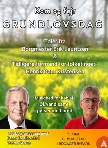 Vi fejrer Grundlovsdag i parken i Broager, hvor der vil være musik, samt taler fra Blandt andet Folketingets tidligere formand Henrik Dam Kristensen, Samt Borgmester Erik Lauritzen